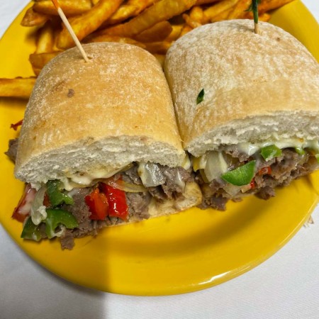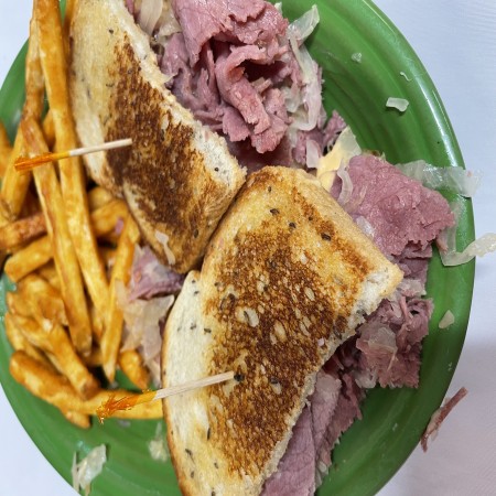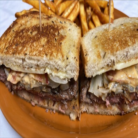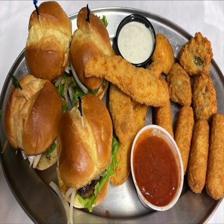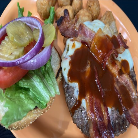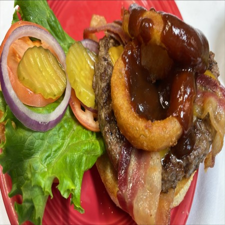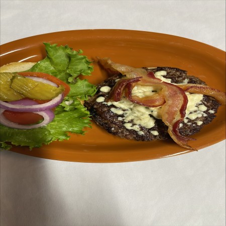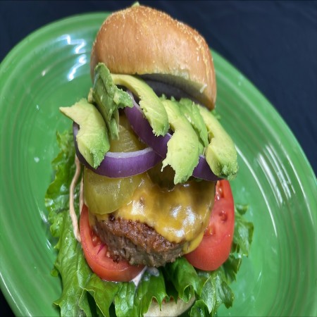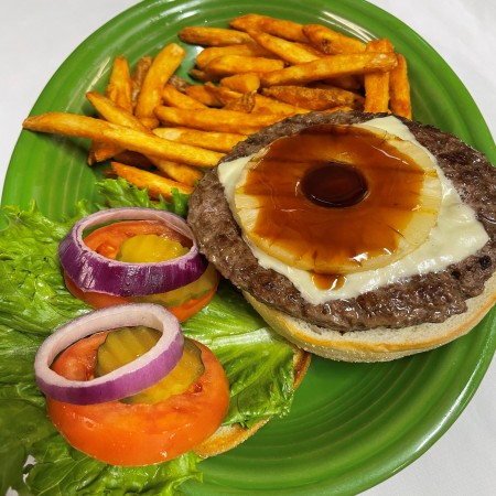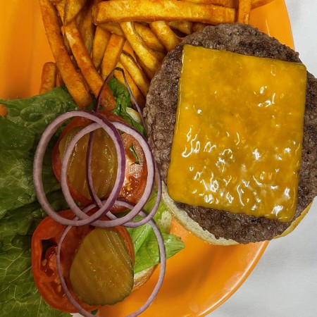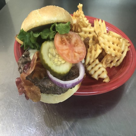 All burgers are 1/2 lb. Burger and sandwiches are served with fries, waffle fries, coleslaw or salad. Substitute for fries: onion rings, fried mushrooms, fried zucchinis, fried pickles, for an additional charge.