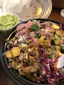 A delicious burrito served in a bowl. All bowls are served with rice, black beans and queso fresco